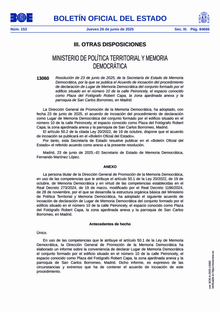 Resolución de 23 de junio de 2025, de la Secretaría de Estado de Memoria Democrática, por la que se publica el Acuerdo de incoación del procedimiento de declaración de Lugar de Memoria Democrática del conjunto formado por el edificio situado en el número 10 de la calle Peironcely, el espacio conocido como Plaza del Fotógrafo Robert Capa, la zona ajardinada anexa y la parroquia de San Carlos Borromeo, en Madrid.