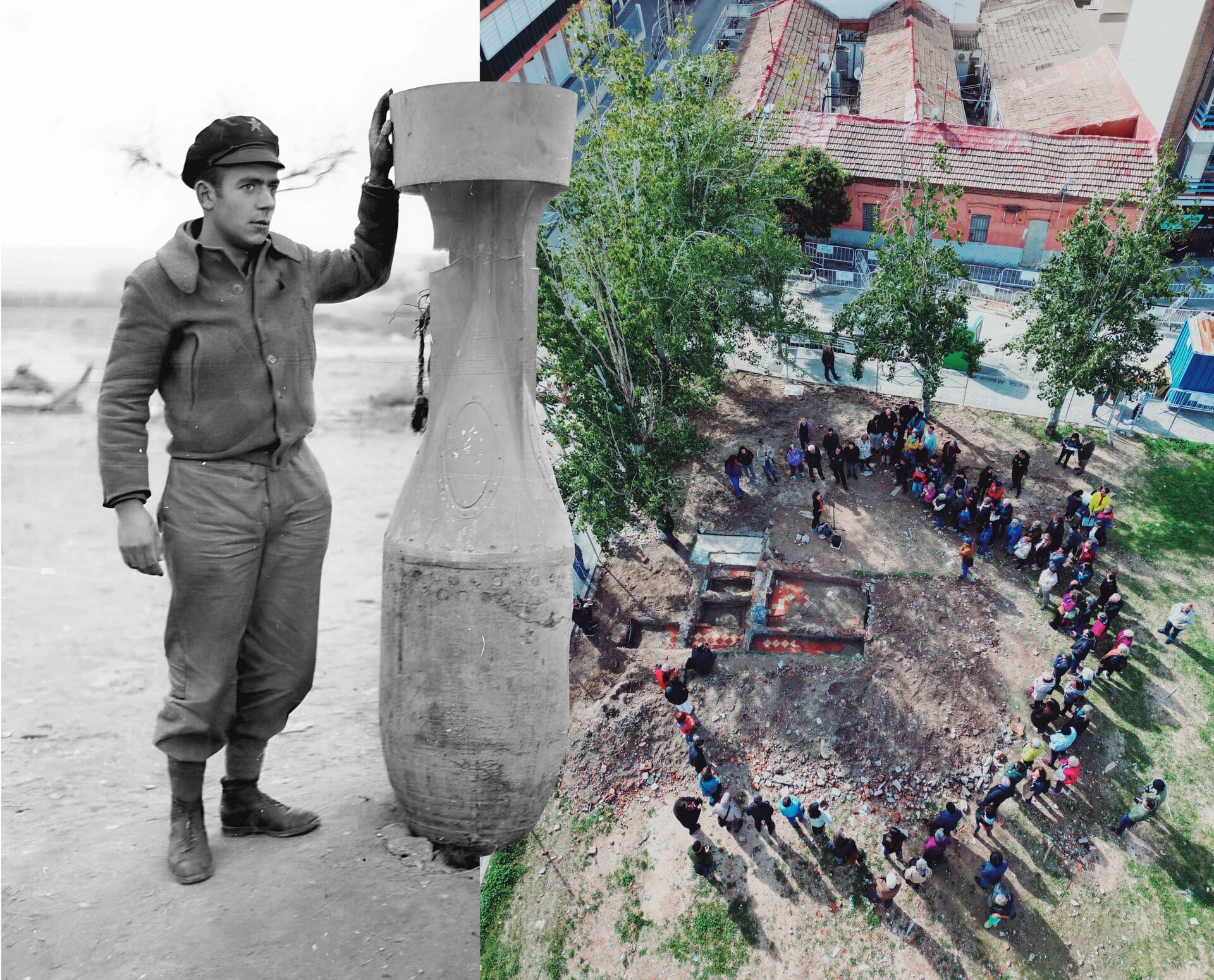 Miliciano republicano junto a una bomba italiana Topedine, de 100 kg, que no estalló. Este fue uno de los tipos de munición, cargada con 50 kg de TNT, que se arrojó sobre la población civil de Madrid.
