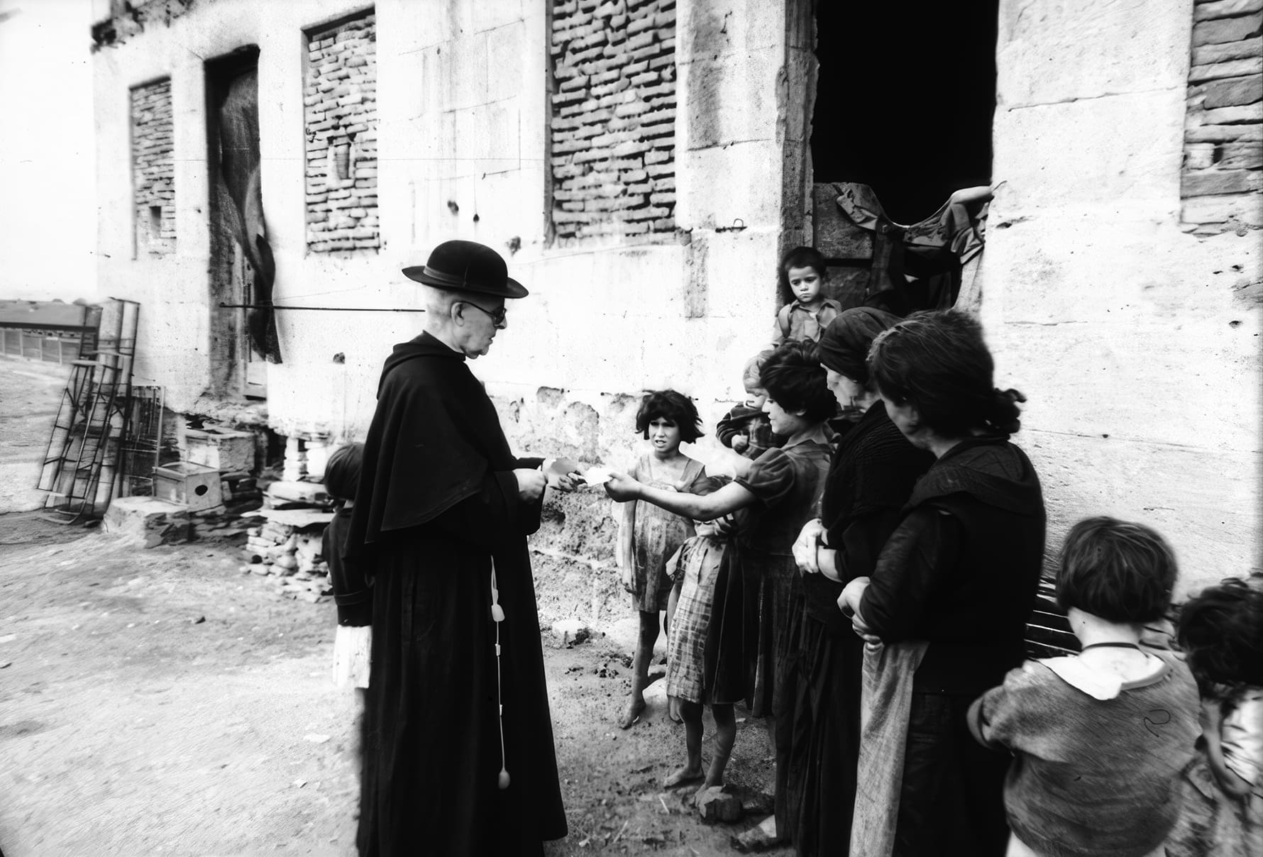 Imágenes procedentes del fondo fotográfico de Martín Santos Yubero, conservadas en el Archivo Regional de la Comunidad de Madrid. Pertenecen a dos reportajes distintos, realizados en enero y octubre de 1941, y están archivadas como «Recristianización de los suburbios (barrio de Entrevías). Interiores de viviendas pobres. Niños besando la mano al sacerdote» (14 fotos) y «Labor de apostolado en el barrio de Entrevías» (8 fotos).